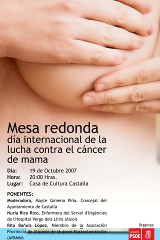 Con motivo del Día Mundial de la Lucha contra el Cáncer, que se conmemora este viernes, el Partido Socialista Obrero Español (PSOE) de Castalla ha organizado una mesa redonda sobre el cáncer de mamá. El acto comenzará a las 20:00 horas del 19 de octubre en la Casa de Cultura.