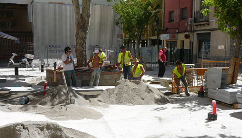 Comsa calcula que la pavimentación de la plaza La Palla, que tiene una superficie de 1.347 metros cuadrados, estará finalizada en tres semanas. Mientras tanto otra cuadrilla de operarios especializados en la colocación de estas losetas, trabajará en la calle San Roque. Después, se pavimentará la calle Mayor y Trinquet.