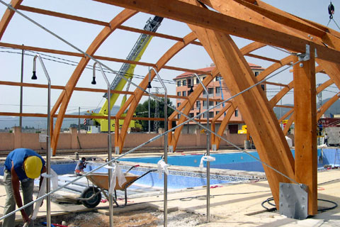 Queda pendiente la instalación de la membrana que cubrirá la estructura de madera, que ya está totalmente montada, y la puesta en marcha de la maquinaria de climatización de la piscina, actuaciones que no se ejecutarán hasta que no pase el verano.