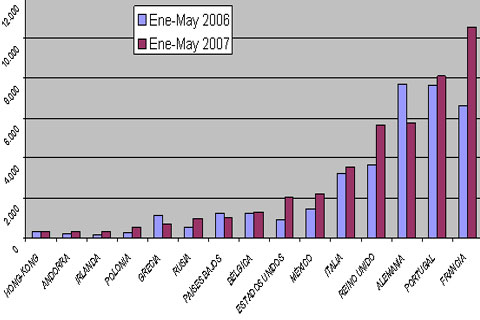 Por lo que respecta a los países destino de las exportaciones jugueteras, los principales representantes de la UE, como Francia, Portugal, Alemania o Reino Unido copan las primeras posiciones. Destaca, a pesar de estar en la “zona dólar”, el crecimiento de las exportaciones a Estados Unidos (incremento de un 121%) y México (+40% crecimiento en valor), país en que el juguete español goza de una posición privilegiada, y que la AEFJ refuerza anualmente mediante la organización anual de la “Exposición de Juguetes españoles en México”.