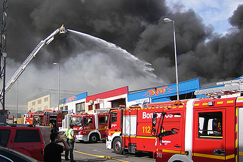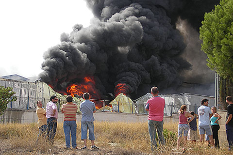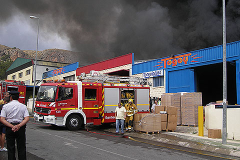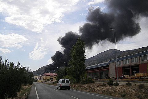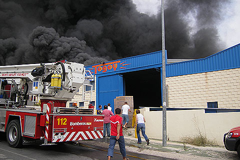 Escaparate/Onil. Durante más de tres horas, una nube de humo negro se elevaba por Onil, testigo del grave incendio que estaba afectando a cinco naves del polígono industrial Los Vasallos, en concreto a dos empresas. Sobre las dos y media de la tarde del miércoles, tres trabajadores de la empresa Togoy daban la voz de alarma al comprobar que en la parte trasera del almacén se había producido un incendio. Sobre las tres llegaron las primeras dotaciones de bomberos procedentes del subparque de Ibi. Teniendo en cuenta el peligro que suponía que el incendio se extinguiera a las naves colindantes de la parte superior, los bomberos comenzaron a proteger el pasillo de acceso a las otras fábricas para evitar que las llamas llegaran hasta allí. Los trabajadores de las cinco empresas procedieron a vaciar las naves para que en caso de que el incendio se propagara, éstas no tuvieran material que aumentara el fuego. Algo que finalmente no ocurrió.