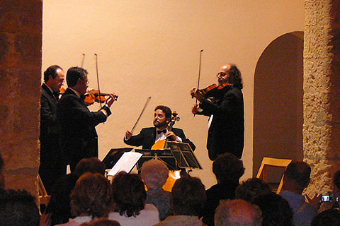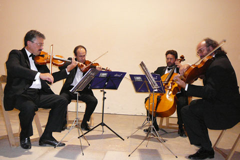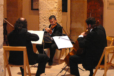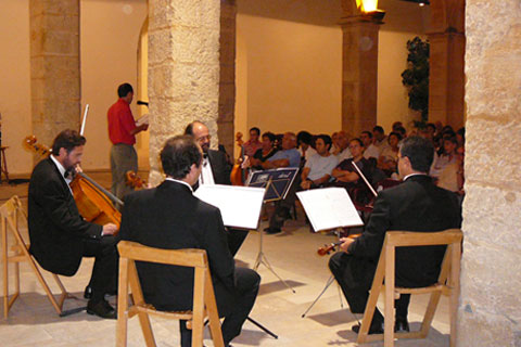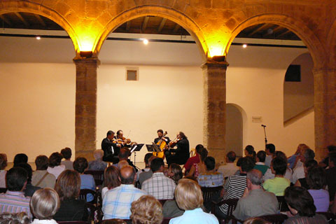 Escaparate/ONIL. El Cuarteto Almus ofreció un original concierto de música de cámara en un marco incomparable: el Claustro del Palacio Municipal de Onil, el viernes por la noche. Más de 250 de personas asistieron a la presentación en primicia del segundo disco grabado hace unos meses por el Cuarteto y que ha salido a la venta recientemente con el sello discográfico de RTVE.