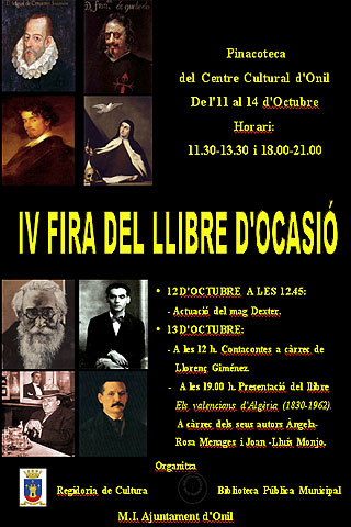Escaparate/ONIL. Hoy jueves se inaugura la cuarta edición de la Feria del Libro de Ocasión en la pinacoteca del Centro Cultural de Onil. Hasta el 14 de octubre, se expondrán libros, DVD’s, Cd’s y videos de segunda mano que la gente ha ido depositando en la biblioteca con anterioridad para su posterior venta. El precio será el que haya marcado su antiguo propietario.