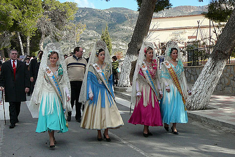 La comitiva, formada por las reinas y damas de honor, autoridades locales, eclesiásticas y banda de música, acudía a media mañana a la celebración de la Misa Mayor y posteriormente a la ofrenda de flores.