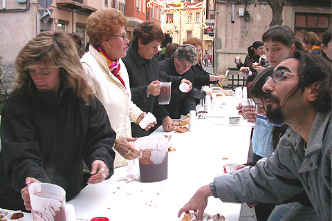 Música para amenizar la tarde y también merienda para todos, a base de chocolate caliente y saginosa, producto de bollería típico de la localidad que se consume todos los jueves previos a la Cuaresma.
