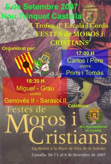 Escaparate/Castalla. Como colofón a las Fiestas de Moros y Cristianos de Castalla, el Club de Pilota Valenciana ‘Nou Trinquet’ y la Agrupación de Comparsas organizan el I Trofeo d’Escala i Corda, que se celebrará en el Nou Trinquet el 5 de septiembre y constará de dos partidas: Carlos y Pere/Primi y Tomás (a las 17:00 horas) y Miguel y Grau/Genovés II y Sarasol II (18:30).