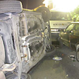 Debido a la gran velocidad a la tomó la curva, el coche que conducía volcó y fue colisionando con los vehículos que estaban estacionados, provocando importantes desperfectos en tres de ellos y también en una motocicleta.