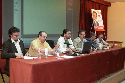 José Antonio Galvañ, concejal de Cultura de Onil y candidato a la Alcaldía; Francisco Agulló, de Alcoy; Pasqual Mollá de Elche, Héctor VIdal de Villlena y Fernando Albors de Cocentaina estuvieron compartiendo mesa con el candidato de Ibi. Cada uno de ellos habló sobre algún aspecto de su gestión. Así Galvañ estuvo explicando que durante estos cuatros años el gobierno de Onil ha apostado por dinamizar las asociaciones culturales locales para hacerlas más partícipes de la vida cultural. Por su parte, el concejal de Cocentaina estuvo hablando de cómo habían gestionado el servicio de recogida de basura.