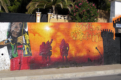 El graffiti ocupa gran parte del muro que hay en la avenida y los dibujos están relacionados con la fiesta, entre ellos, los escudos de todas las comparsas.