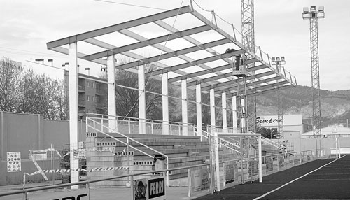 La empresa castallense Estructuras y Obras Ribeco está acometiendo desde hace unos días los trabajos de cubrición de las gradas del campo de fútbol por un importe de 54.943 euros.