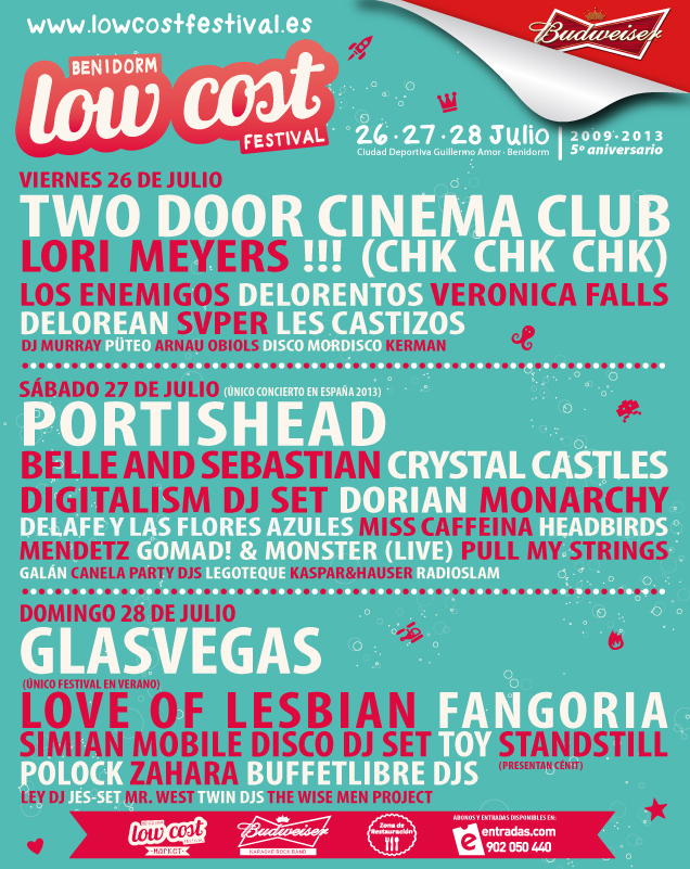 Del 26 al 28 de julio se celebrará, en la Ciudad Deportiva Guillermo Amor de Benidorm, el Low Cost Festival, tres días frenéticos de música en directo con un cartel que ya cuenta con bandas de la talla de Two Door Cinema Club, Belle & Sebastian, Crystal Castles, Love of Lesbian, Fangoria, Lori Meyers, Delorentos, Glasvegas o Los Enemigos, y que tiene como guinda especial la única actuación en festivales nacionales de Portishead, la banda británica liderada por Beth Gibbons y Geoff Barrow.